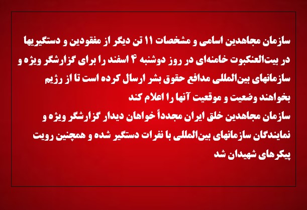 برلین-۱۹ بهمن۱۴۰۴ کنفرانس ایران: چشم انداز تغییر با حضور خانم مریم رجوی رئیس جمهور برگزیده مقاومت نمایندگان مجلس فدرال آلمان و شخصیتهای سیاسی شارل میشل – رئیس شورای اروپا ۲۰۲۴-۲۰۱۹، نخستوزیر بلژیک ۲۰۱۹-۲۰۱۴ سفیر یوآخیم روکر – رئیس شورای حقوقبشر مللمتحد(۲۰۱۵) سفیر آلمان در شورای حقوق بشر ۲۰۱۶-۲۰۱۴ سفیر رابرت جوزف -معاون پیشین وزیر امور خارجه آمریکا در امور کنترل تسلیحات و امنیت بین المللی آندرئاس راینیکه -رئیس انستیتو اورینت آلمان،سفیر پیشین آلمان در سوریه و تونس […]